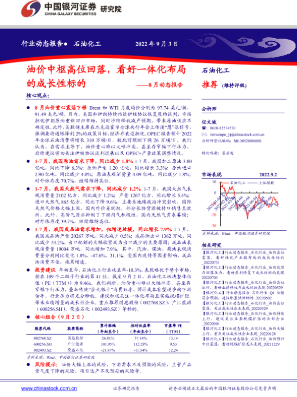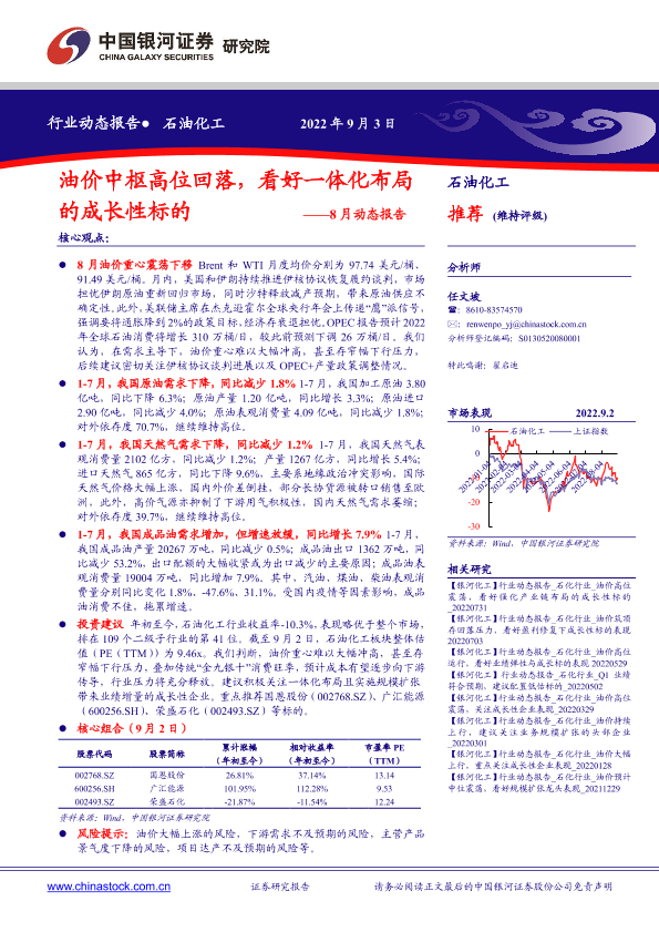 【银河证券】【20220903】石油化工行业8月动态报告:油价中枢高位回落,看好一体化布局的成长性标的-24页