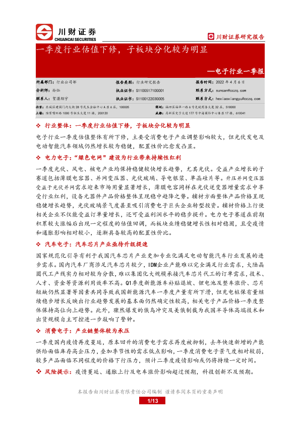 【川财证券】【20220406】20220406-川财证券-电子行业一季报:一季度行业估值下修,子板块分化较为明显-13页