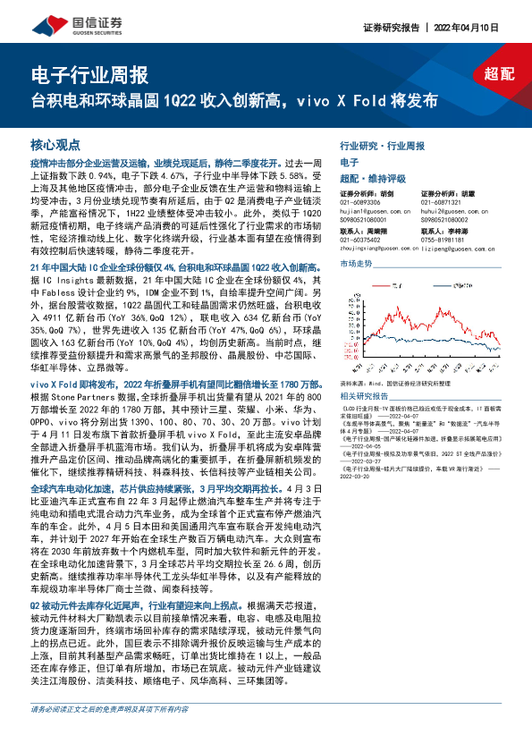 【国信证券】【20220410】电子行业周报:台积电和环球晶圆1Q22收入创新高,vivo X Fold将发布-13页