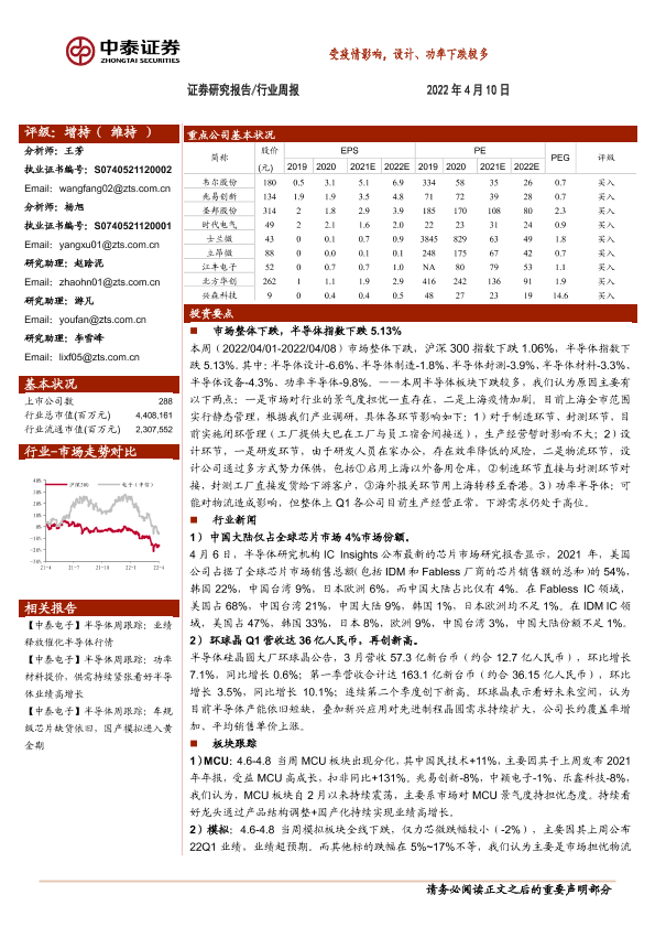 【中泰证券】【20220410】20220410-中泰证券-电子行业周报:受疫情影响,设计、功率下跌较多-16页