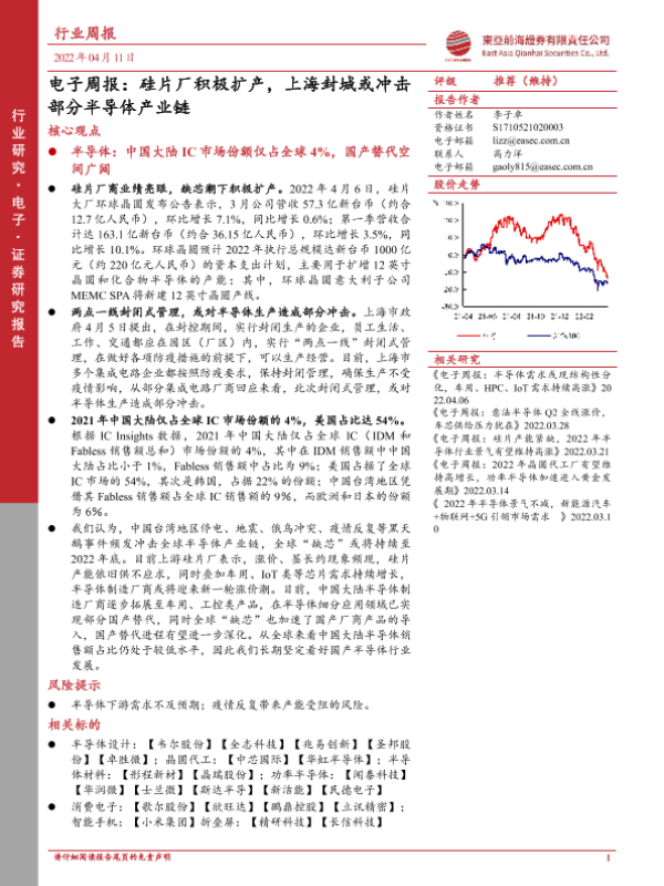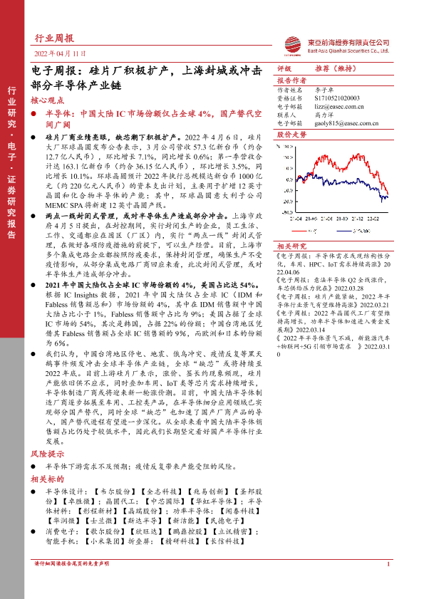 【东亚前海证券】【20220411】电子周报:硅片厂积极扩产,上海封城或冲击部分半导体产业链-16页