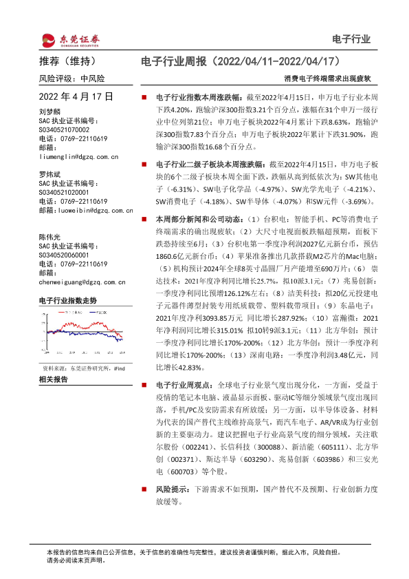 【东莞证券】【20220417】20220417-东莞证券-电子行业周报:消费电子终端需求出现疲软-13页