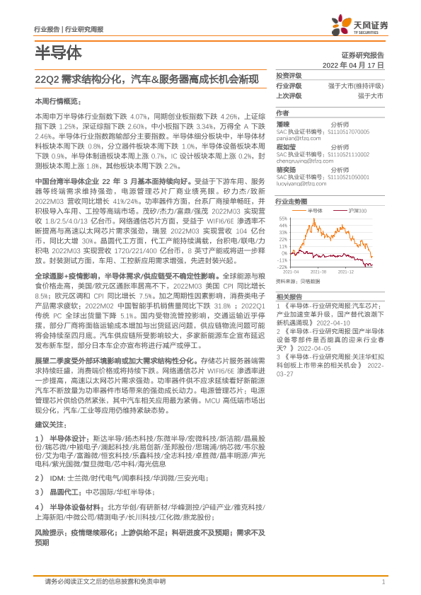 【天风证券】【20220417】20220417-天风证券-半导体行业研究周报:22Q2需求结构分化,汽车&服务器高成长机会渐现-16页