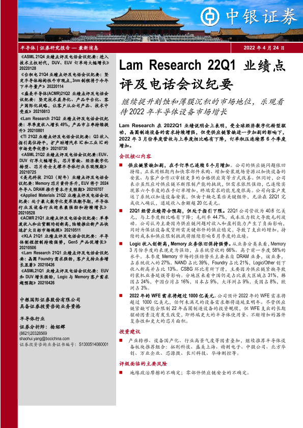 【中银证券】【20220424】Lam Research 22Q1业绩点评及电话会议纪要:继续提升刻蚀和薄膜沉积的市场地位,乐观看待2022年半导体设备市场增长-13页