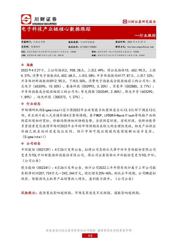【川财证券】【20220427】电子科技产业链核心数据跟踪-3页