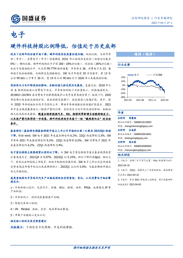 【国盛证券】【20220427】电子行业专题研究:硬件科技持股比例降低,估值处于历史底部-21页
