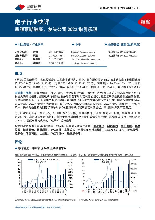 【国信证券】【20220428】电子行业快评:悲观预期触底,龙头公司2Q22指引乐观-6页