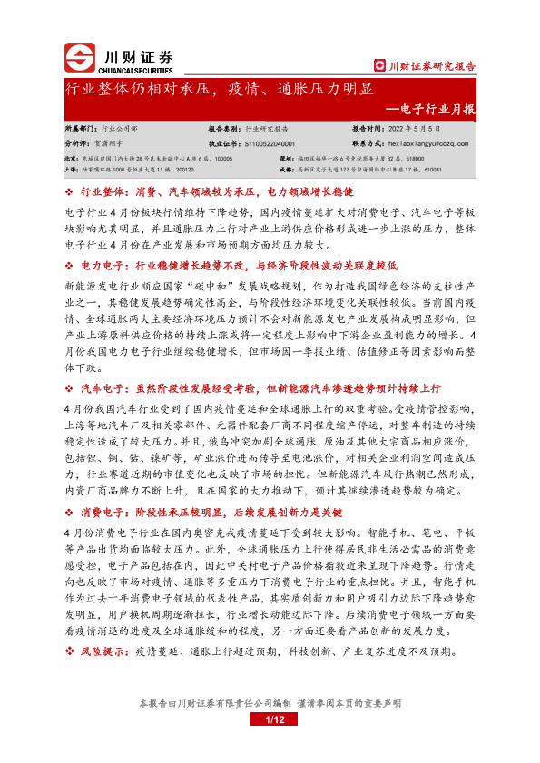【川财证券】【20220505】电子行业月报:行业整体仍相对承压,疫情、通胀压力明显-12页