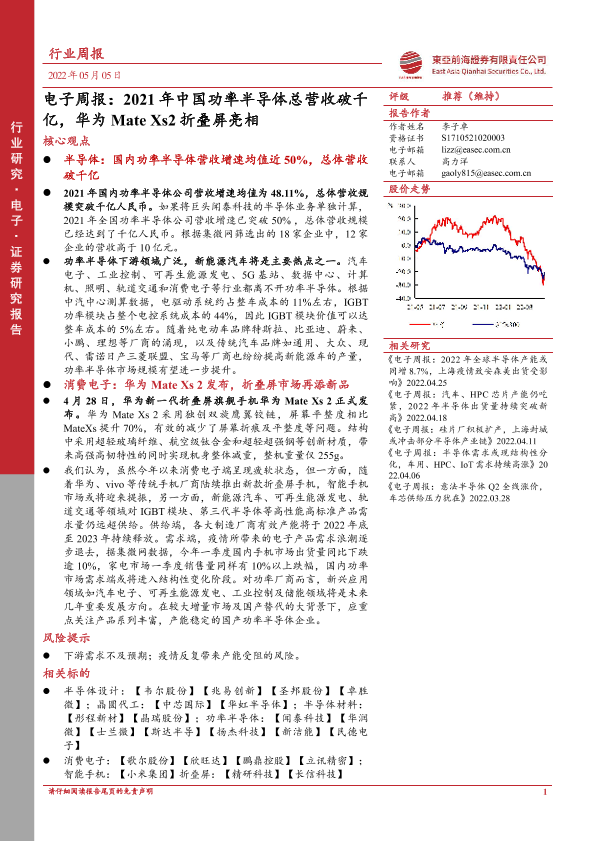 【东亚前海证券】【20220505】电子周报:2021年中国功率半导体总营收破千亿,华为MateXs2折叠屏亮相-17页