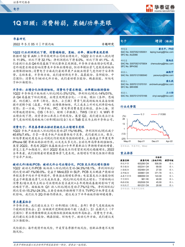 【华泰证券】【20220505】20220505-华泰证券-电子专题研究:1Q回顾:消费转弱,果链 功率亮眼-13页