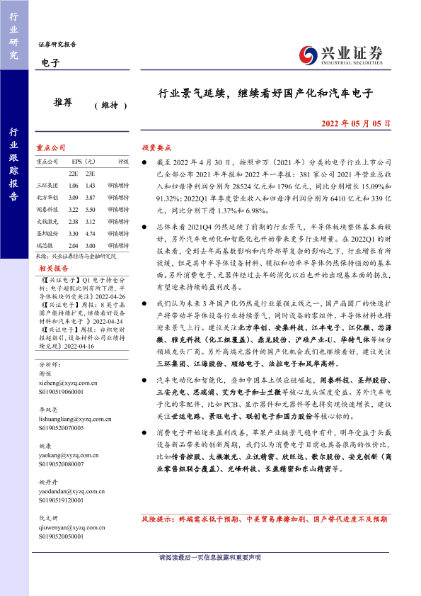 【兴业证券】【20220505】行业景气延续,继续看好国产化和汽车电子-16页