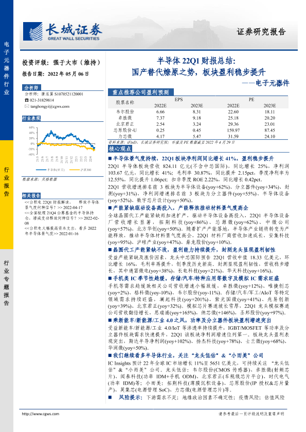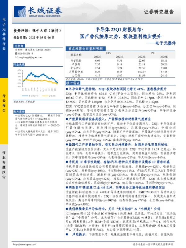 【长城证券】【20220506】电子元器件半导体22Q1财报总结:国产替代燎原之势,板块盈利稳步提升-9页