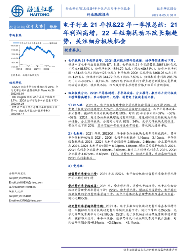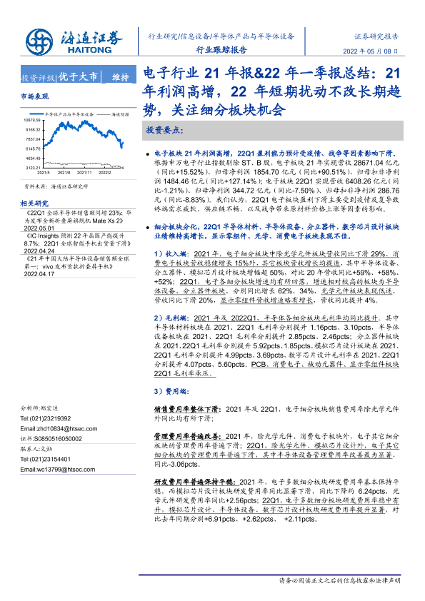 【海通证券】【20220508】20220508-海通证券-电子行业21年报&22年一季报总结:21年利润高增,22年短期扰动不改长期趋势,关注细分板块机会-8页