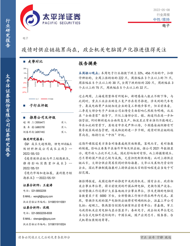 【太平洋证券】【20220508】20220508-太平洋-电子行业周报:疫情对供应链拖累尚在,政企机关电脑国产化推进值得关注-13页