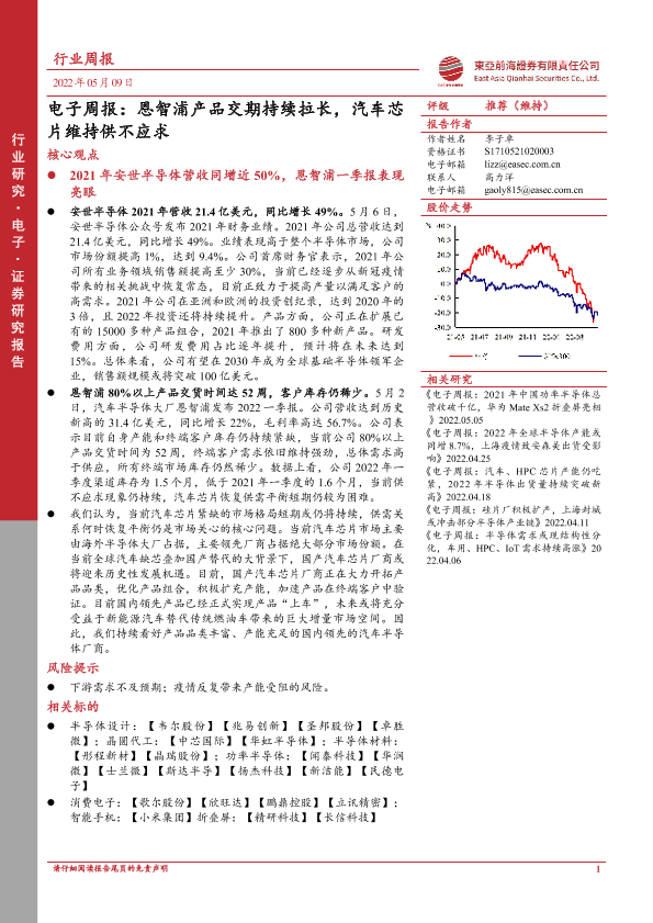 【东亚前海证券】【20220509】电子周报:恩智浦产品交期持续拉长,汽车芯片维持供不应求-15页