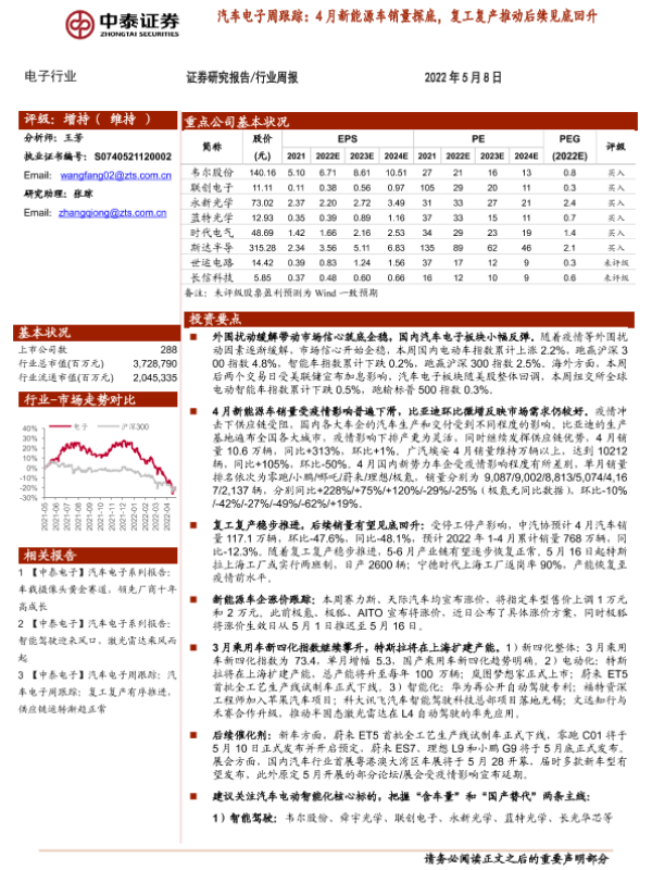 【中泰证券】【20220508】汽车电子周跟踪:4月新能源车销量探底,复工复产推动后续见底回升-19页