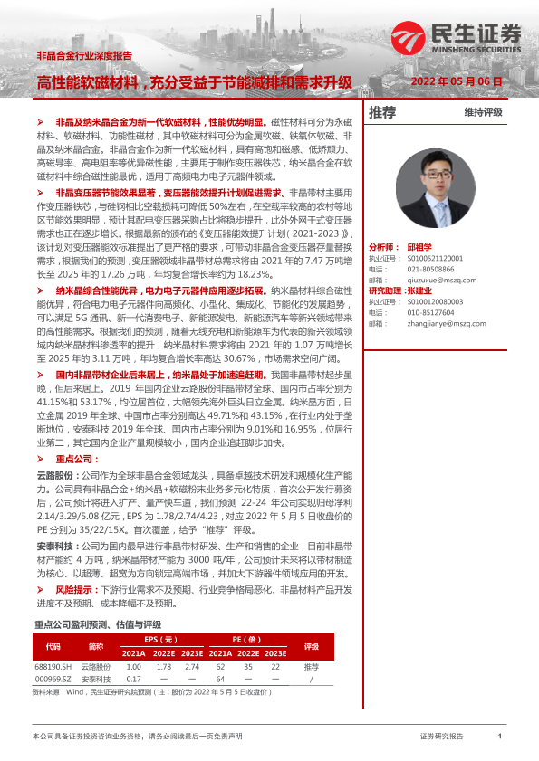 【民生证券】【20220506】非晶合金行业深度报告:高性能软磁材料,充分受益于节能减排和需求升级-40页