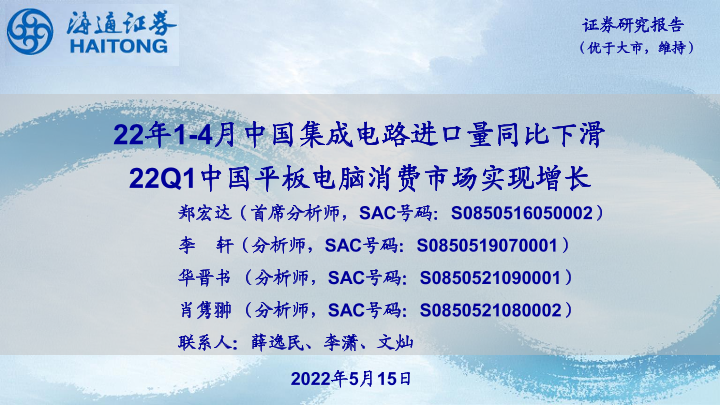 【海通证券】【20220515】22年1-4月中国集成电路进口量同比下滑 22Q1中国平板电脑消费市场实现增长-10页