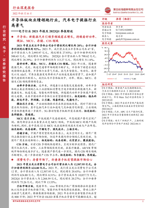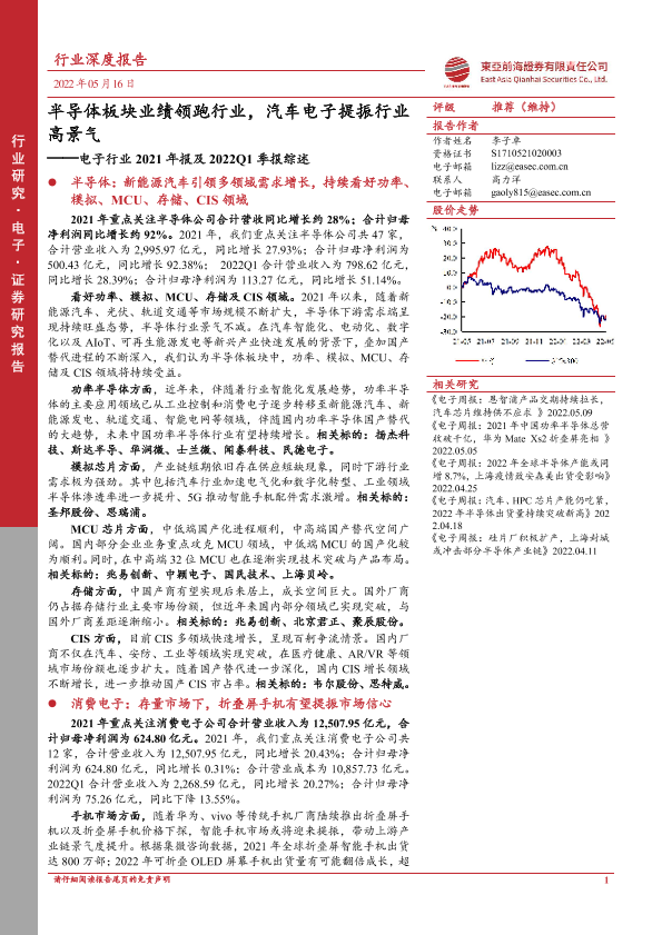 【东亚前海证券】【20220516】电子行业2021年报及2022Q1季报综述:半导体板块业绩领跑行业,汽车电子提振行业高景气-28页