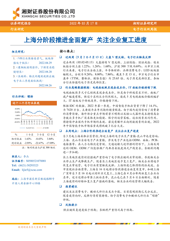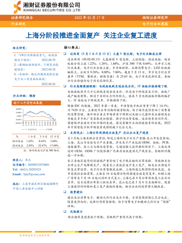 【湘财证券】【20220517】20220517-湘财证券-电子行业双周报:上海分阶段推进全面复产 关注企业复工进度-9页