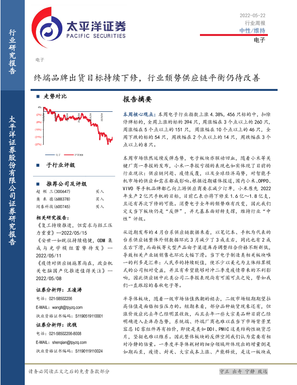 【太平洋证券】【20220522】20220522-太平洋-电子行业周报:终端品牌出货目标持续下修,行业颓势供应链平衡仍待改善-14页