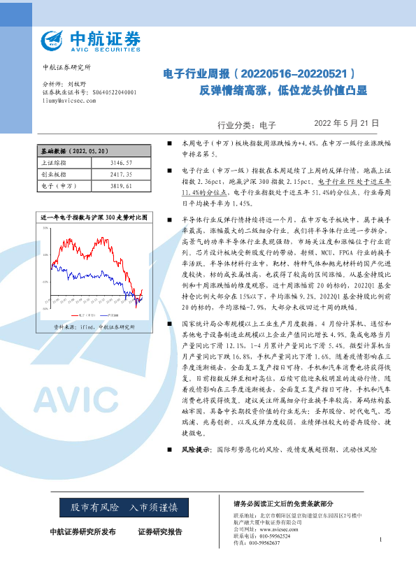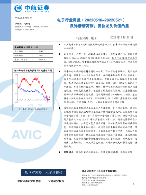 【中航证券】【20220521】电子行业周报:反弹情绪高涨,低位龙头价值凸显-12页