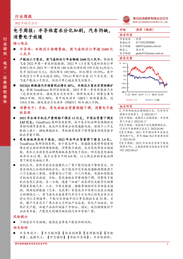 【东亚前海证券】【20220523】电子周报:半导体需求分化加剧,汽车仍缺,消费电子放缓-18页