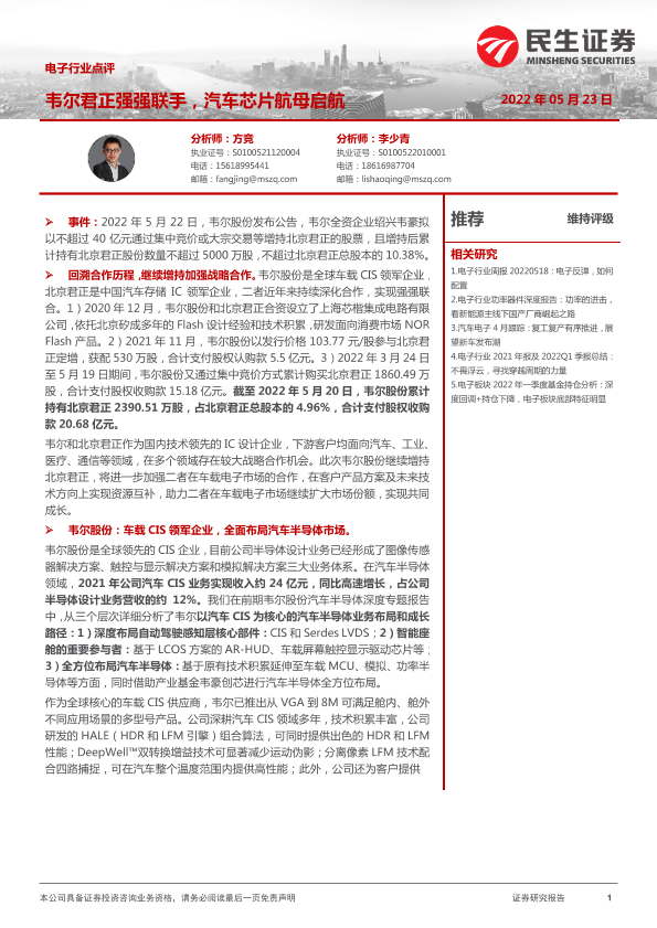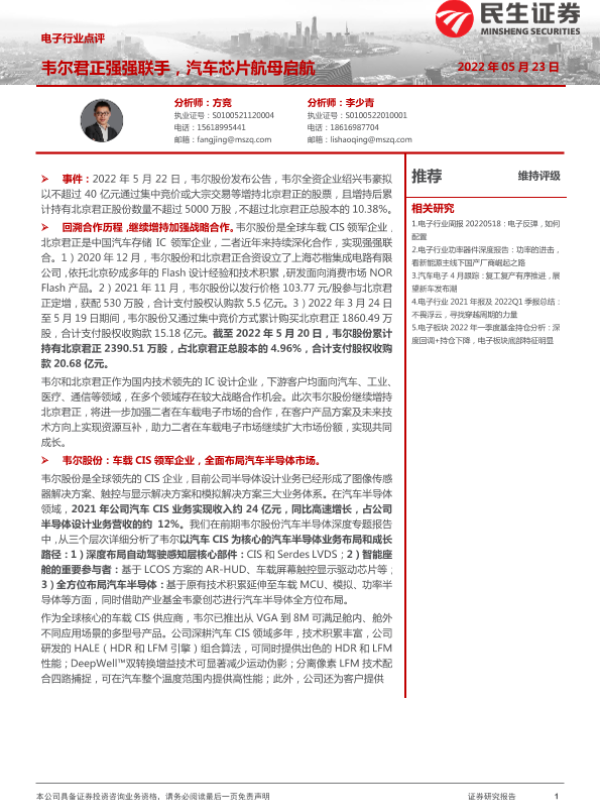 【民生证券】【20220523】电子行业点评:韦尔君正强强联手,汽车芯片航母启航-4页