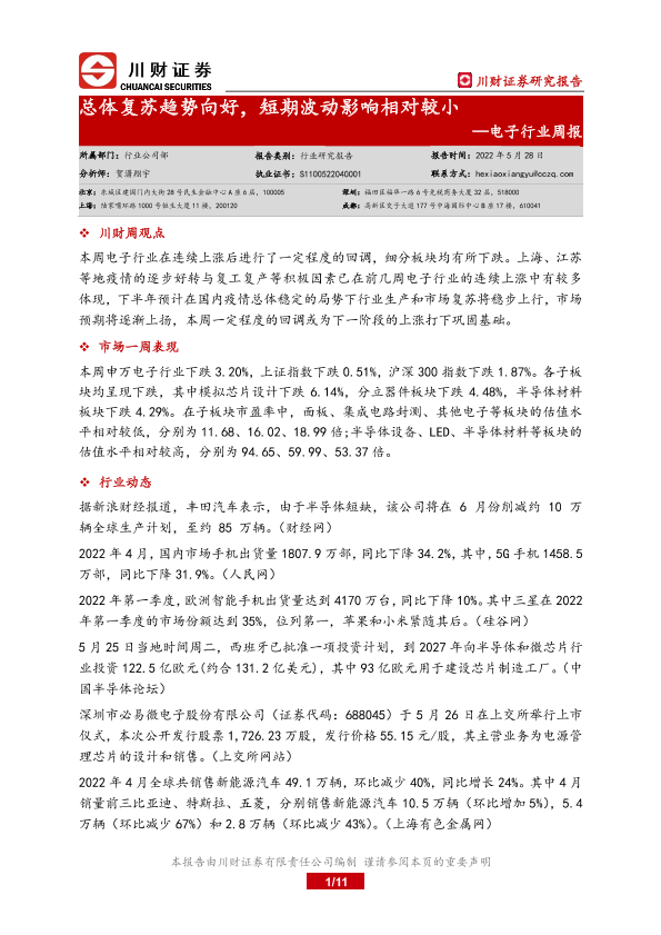 【川财证券】【20220528】20220528-川财证券-电子行业周报:总体复苏趋势向好,短期波动影响相对较小-11页