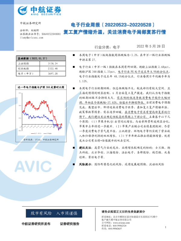 【中航证券】【20220528】20220528-中航证券-电子行业周报:复工复产情绪升温,关注消费电子局部复苏行情-12页