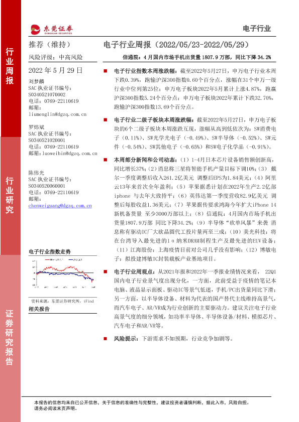 【东莞证券】【20220529】20220529-东莞证券-电子行业周报:信通院:4月国内市场手机出货量1807.9万部,同比下降34.2%-11页