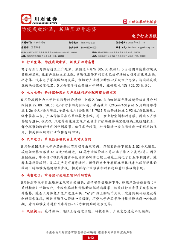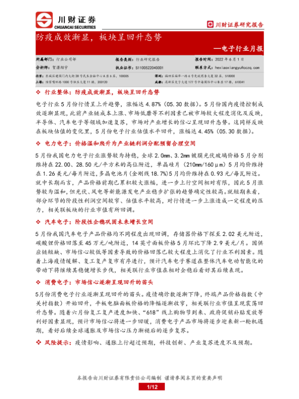【川财证券】【20220601】20220601-川财证券-电子行业月报:防疫成效渐显,板块呈回升态势-12页