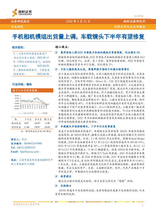 【湘财证券】【20220531】20220531-湘财证券-光学元件行业点评报告:手机相机模组出货量上调,车载镜头下半年有望修复-2页