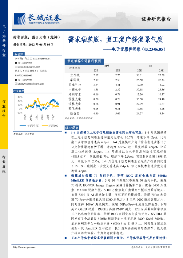 【长城证券】【20220605】电子元器件周报:需求端筑底,复工复产修复景气度-17页