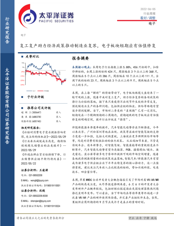 【太平洋证券】【20220605】20220605-太平洋-电子行业周报:复工复产助力经济政策推动制造业复苏,电子板块短期应有估值修复-15页