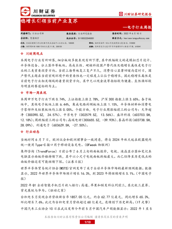 【川财证券】【20220610】20220610-川财证券-电子行业周报:稳增长引领当前产业复苏-10页