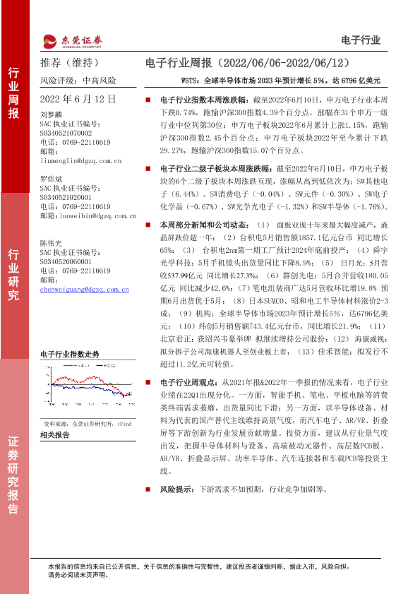 【东莞证券】【20220612】20220612-东莞证券-电子行业周报:WSTS:全球半导体市场2023年预计增长5%,达6796亿美元-13页
