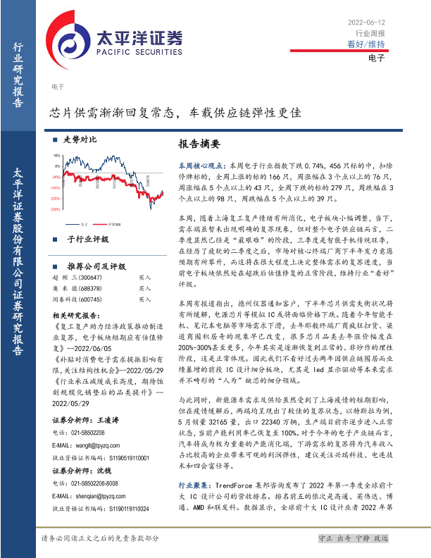 【太平洋证券】【20220612】电子行业周报:芯片供需渐渐回复常态,车载供应链弹性更佳-15页