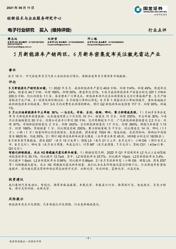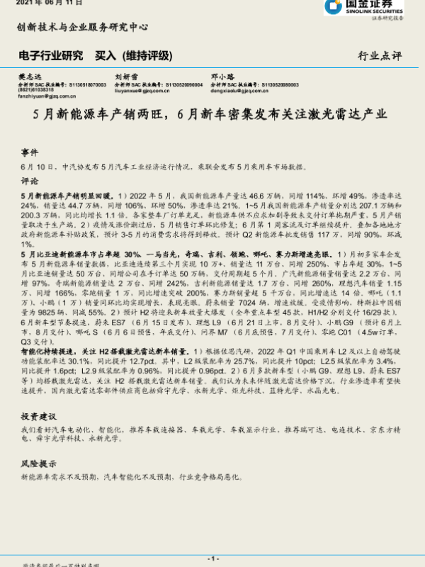 【国金证券】【20220611】20220611-国金证券-电子行业点评:5月新能源车产销两旺,6月新车密集发布关注激光雷达产业-3页