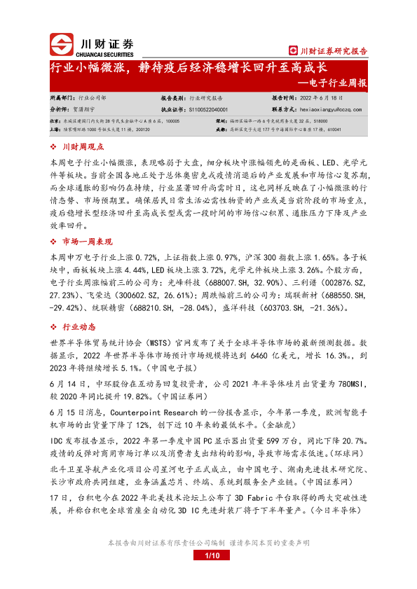 【川财证券】【20220618】20220618-川财证券-电子行业周报:行业小幅微涨,静待疫后经济稳增长回升至高成长-10页