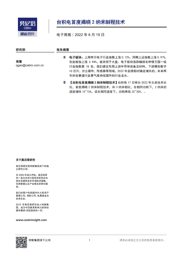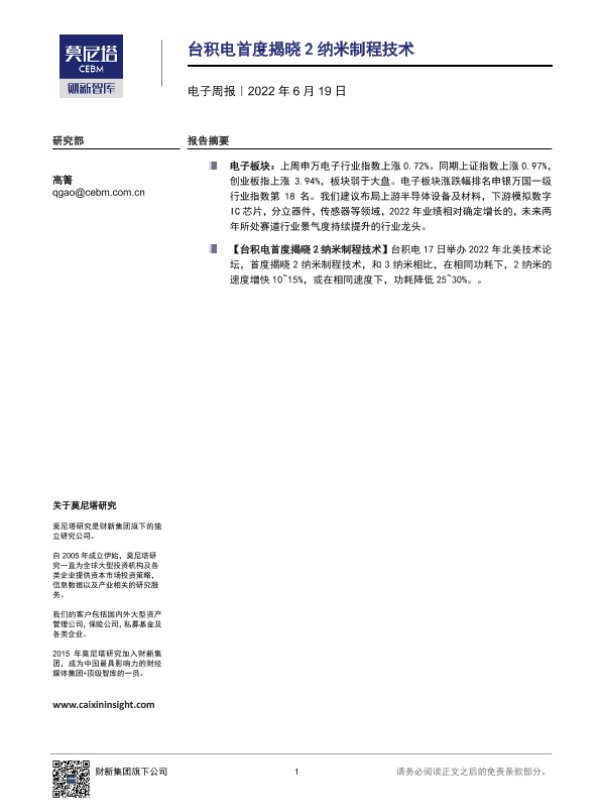 【莫尼塔研究】【20220619】20220619-莫尼塔投资-电子周报:台积电首度揭晓2纳米制程技术-6页