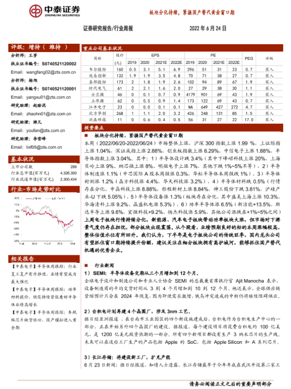 【中泰证券】【20220624】20220624-中泰证券-电子行业周报:板块分化持续,紧握国产替代黄金窗口期-13页