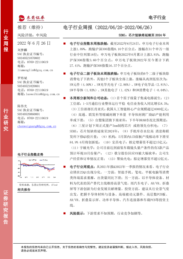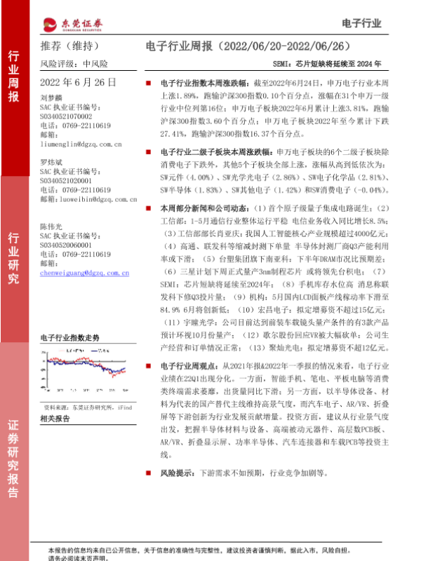 【东莞证券】【20220626】20220626-东莞证券-电子行业周报:SEMI:芯片短缺将延续至2024年-14页