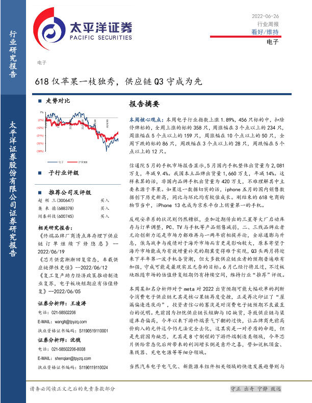 【太平洋证券】【20220626】电子行业周报:618仅苹果一枝独秀,供应链Q3守成为先-16页