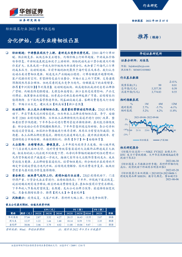 【华创证券】【20220907】纺织服装行业2022年中报总结:分化伊始,龙头业绩韧性凸显-26页