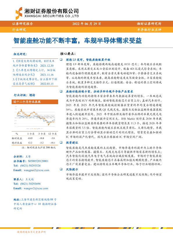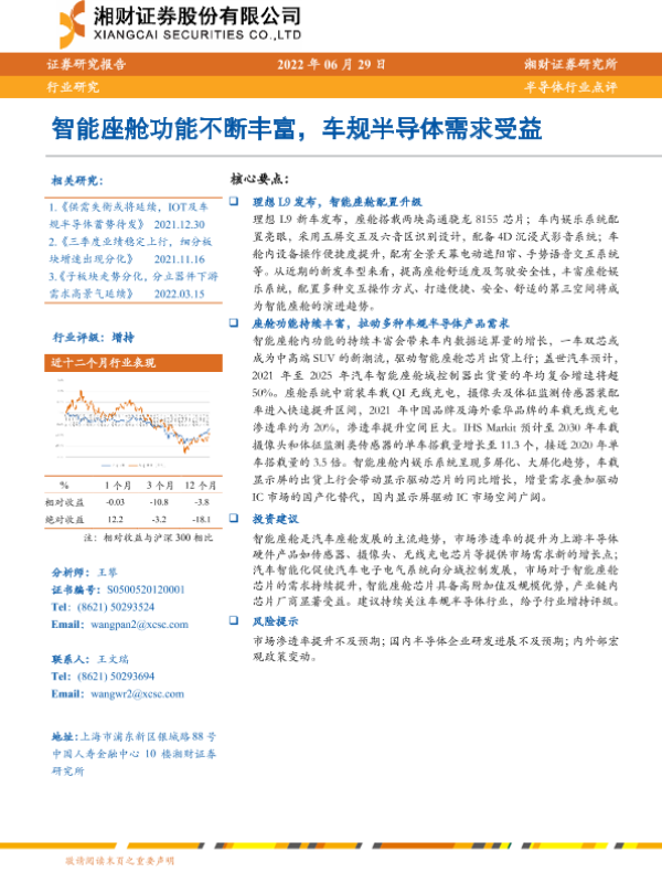 【湘财证券】【20220629】20220629-湘财证券-半导体行业点评:智能座舱功能不断丰富,车规半导体需求受益-7页