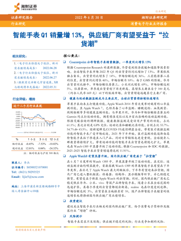 【湘财证券】【20220630】消费电子行业点评报告:智能手表Q1销量增13%,供应链厂商有望受益于“拉货潮”-2页