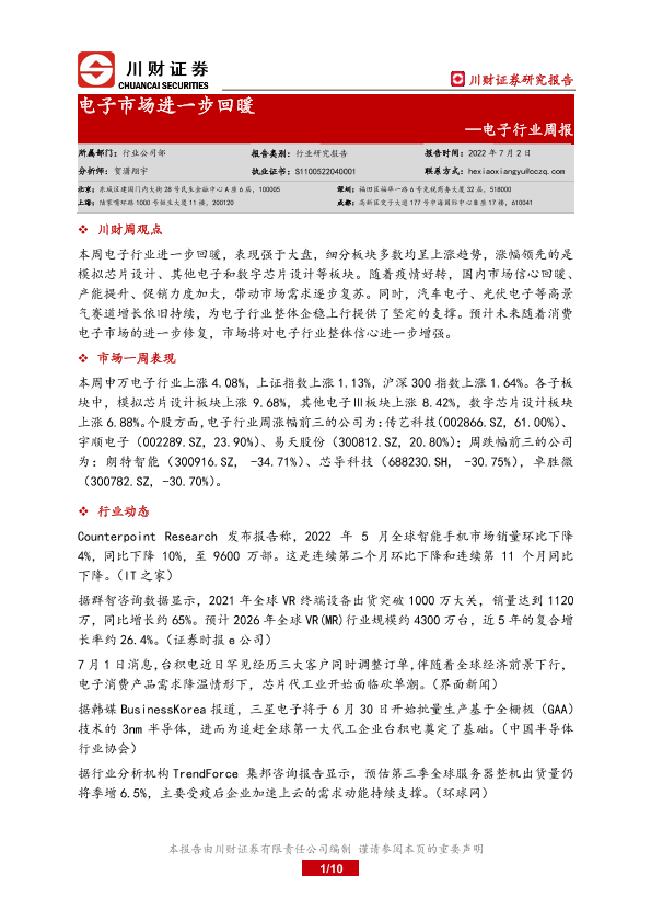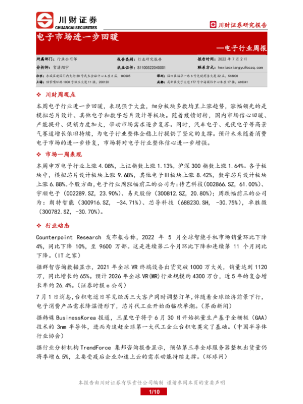 【川财证券】【20220702】20220702-川财证券-电子行业周报:电子市场进一步回暖-10页
