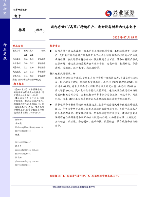 【兴业证券】【20220703】国内存储厂/晶圆厂持续扩产,看好设备材料和汽车电子-9页