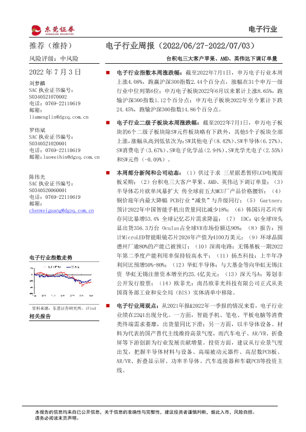 【东莞证券】【20220703】电子行业周报:台积电三大客户苹果、AMD、英伟达下调订单量-16页